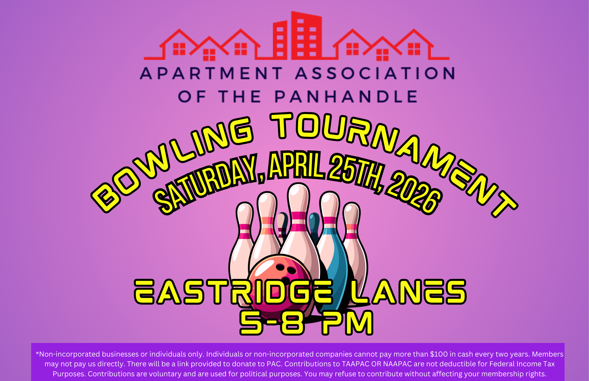 East Ridge Lanes 5405 E Amarillo Blvd, Amarillo, TX, United States2026 AAP Bowling Tournament Saturday, April 25th, 2026 5:00pm - 8:00pm Eastridge Lanes 5405 E Amarillo Blvd, Amarillo, TX 79107