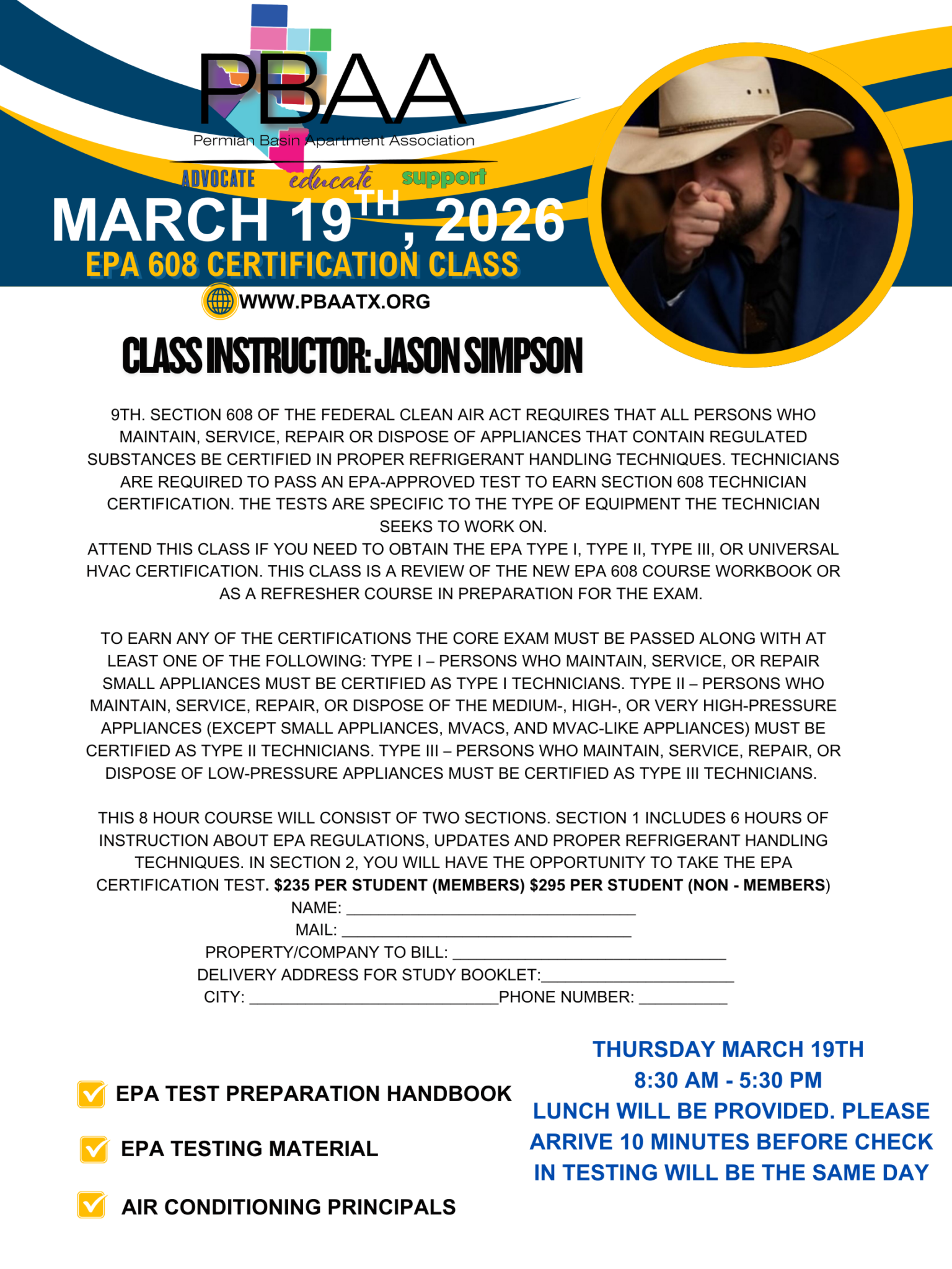 Mar 19 PBAA EPA COURSE 8:00 am - 5:00 pm pbaa office 9601 Wright Dr, Midland Event Details Get Directions